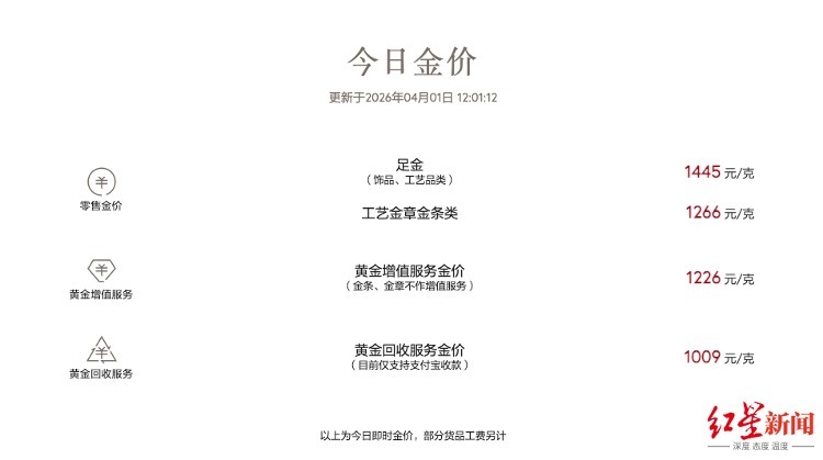 国内金饰价钱相似迎来大涨。红星新闻记者选藏到,4月1日各大品牌金饰价钱无数在每克1440-1450元区间,与前一天比较高潮约每克50元。